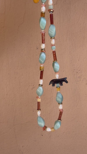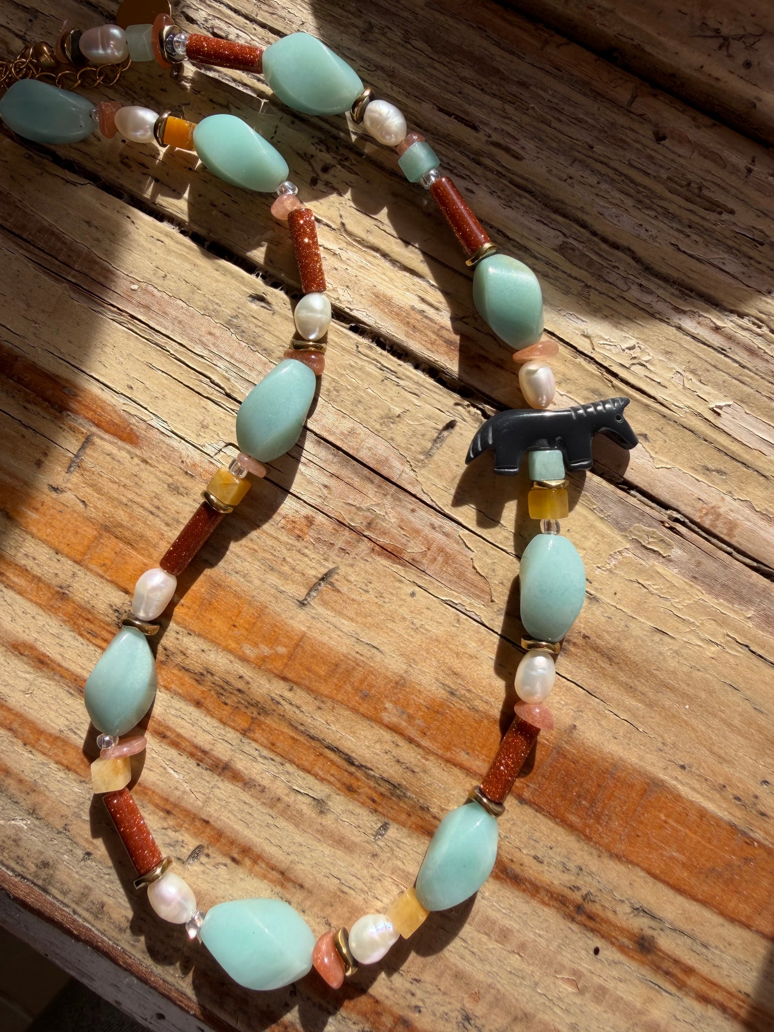 Collier Fonda en acier inoxydable 316L , amazonite, gold sand stone, perles d'eau douce et hématites. Petit cheval en acrylique.