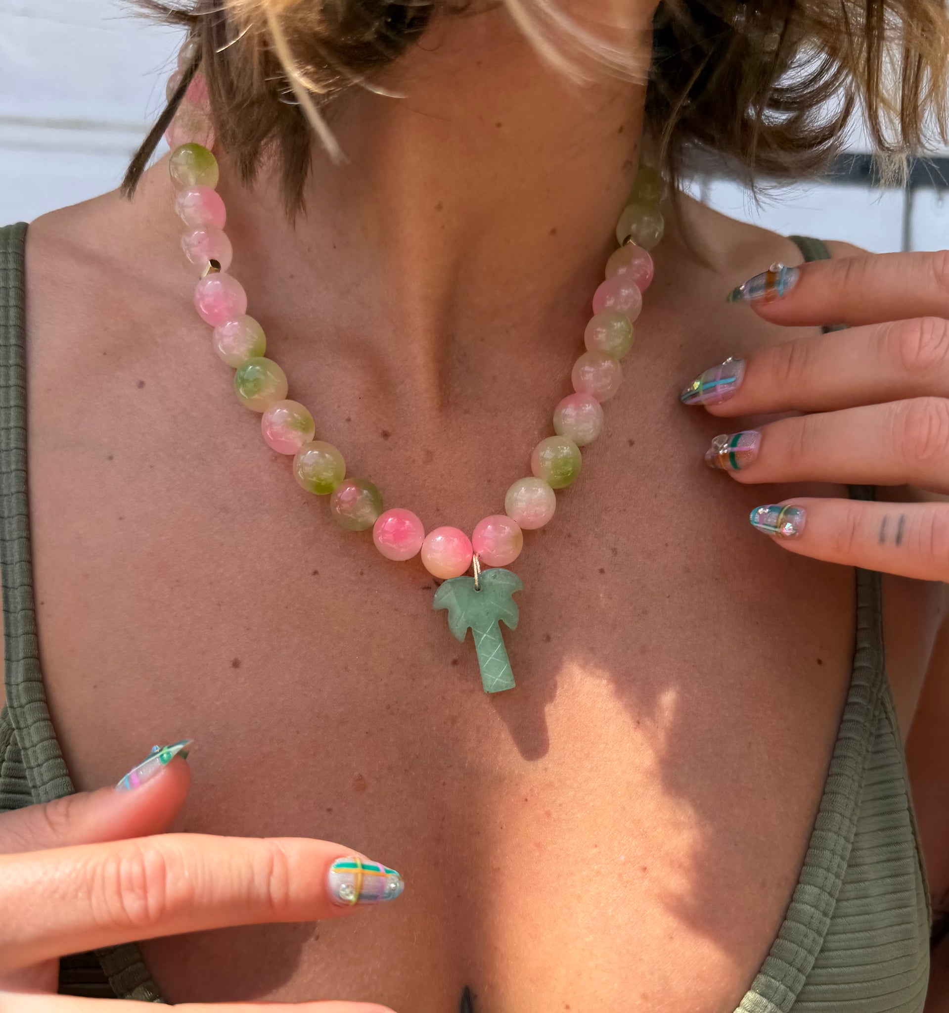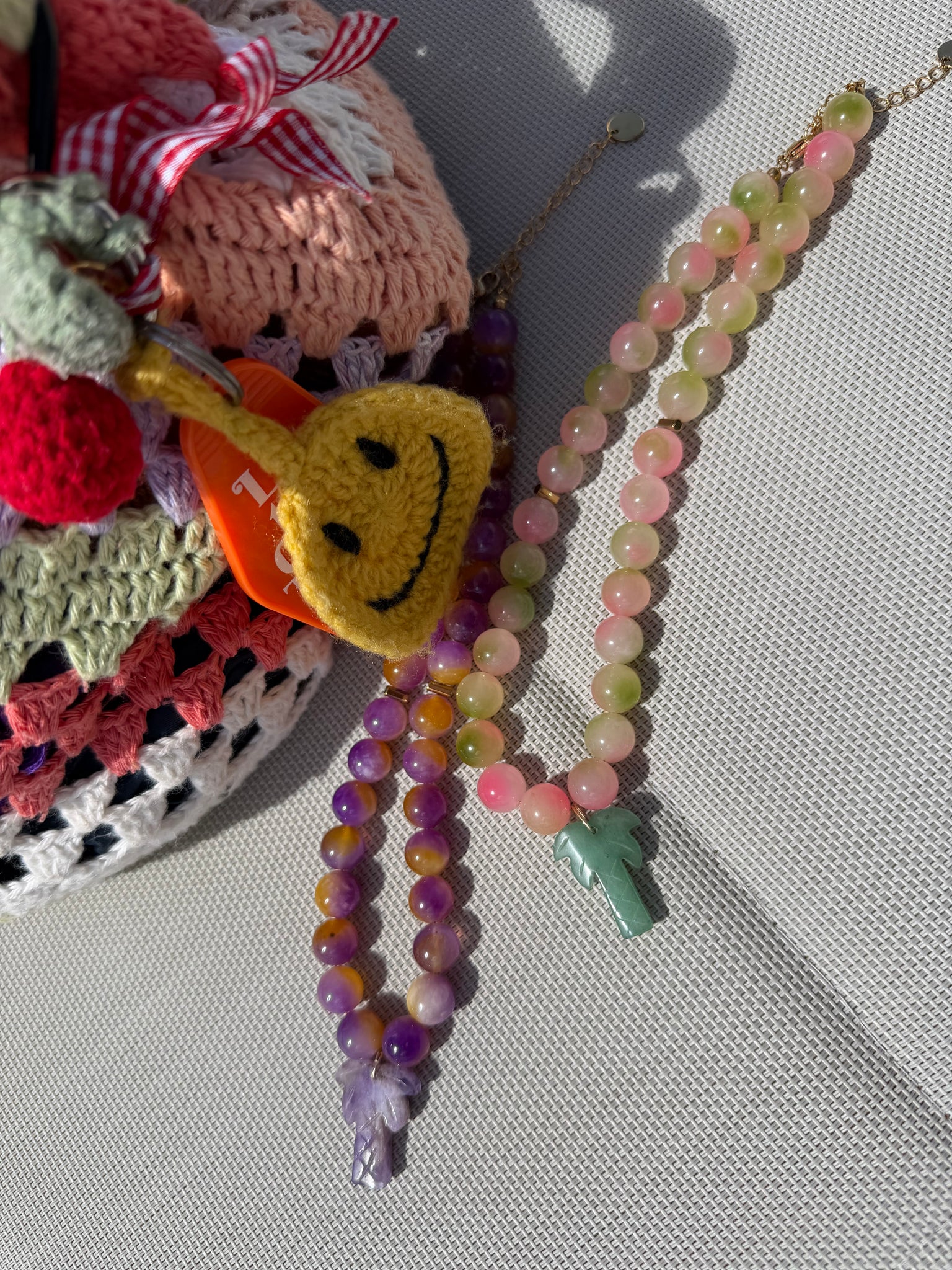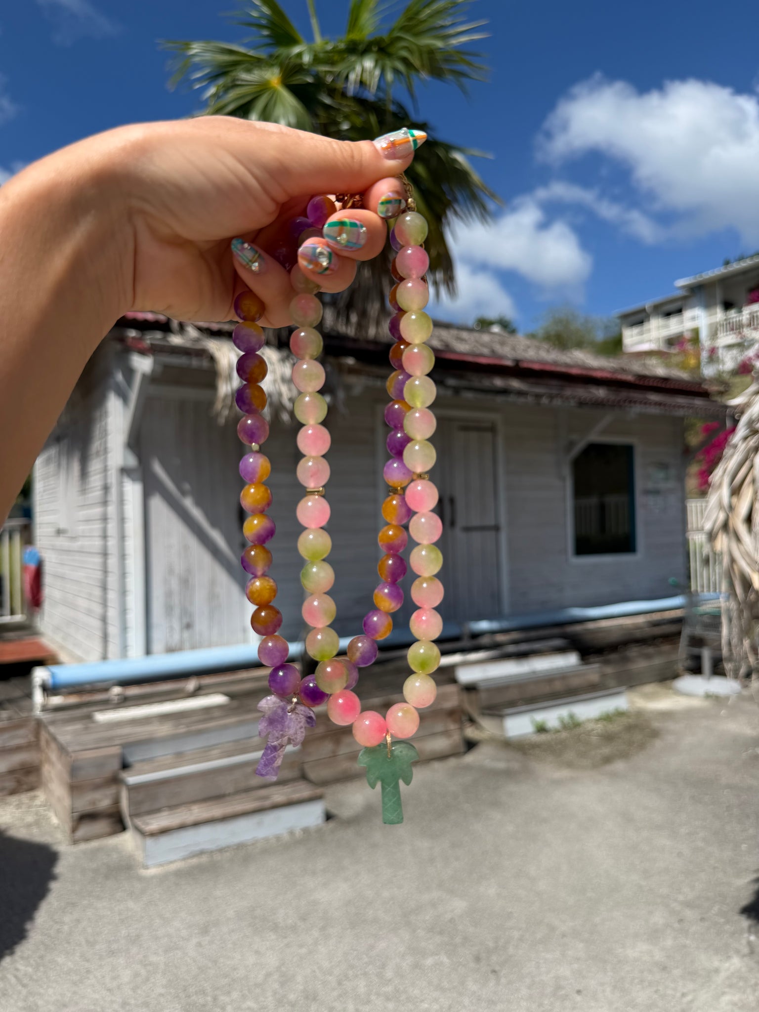 Collier Mauricia en acier inoxydable 316L, perles de verres et pierres au choix : soit Améthyste (pierre violette) avec perles violettes et jaune , soit Aventurine (pierre verte) avec perles rose et verte.